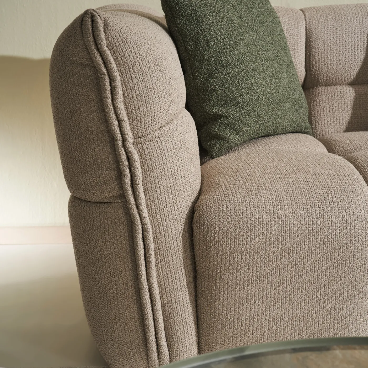 Με ιδιαίτερη έμφαση στην άνεση και τον σχεδιασμό, ο γωνιακός καναπές αυτός ξεχωρίζει για τις έντονες καμπύλες του και το ανάγλυφο καπιτονέ εφέ σε όλη την επιφάνειά του. Η γεμάτη και στιβαρή του αίσθηση προσφέρει μοναδική στήριξη και χαλάρωση. Προσφέρεται με αλέκιαστα – αδιάβροχα – πλενόμενα υφάσματα, στις διαστάσεις της επιλογής σας.
