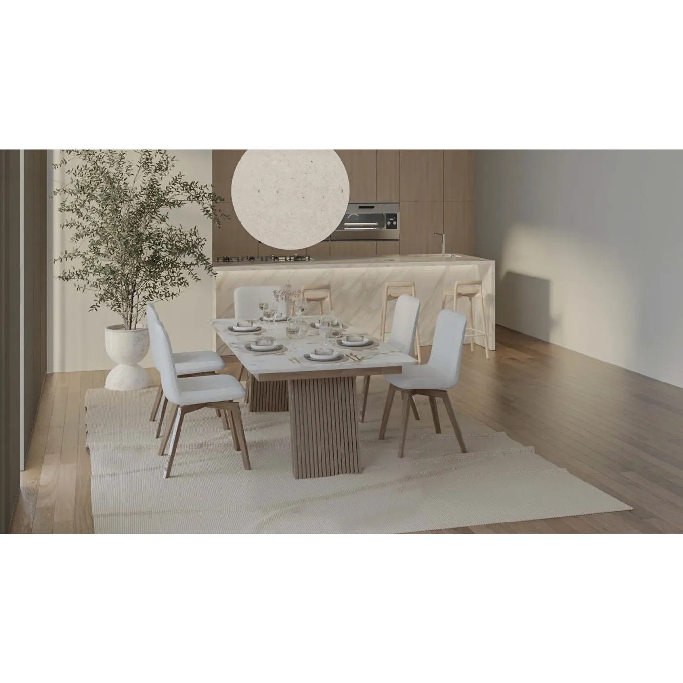 Τραπεζαρία Estia Ceramic με κεραμική επιφάνεια, βάση με κάθετα πηχάκια από μασίφ ξύλο δρυός και λεπτομέρεια γκοφρέ λάκας.